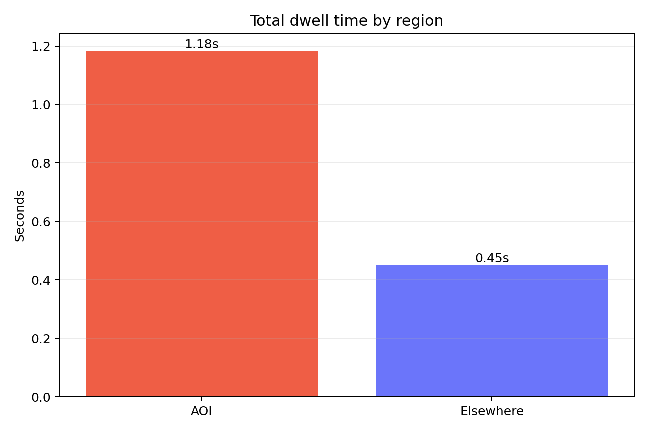 fixations.csv (required)aoi_transitions_dwell.py in the same folder (or a folder of your choice and pass paths on the command line).fixations.csv: start_timestamp: fixation start time (used for temporal order) duration: fixation duration in milliseconds (used for dwell-time totals) norm_pos_x, norm_pos_y: normalized fixation coordinates (used for AOI classification) confidence: fixation confidence (used to optionally filter low-quality fixations) fixations.csvAOI or Elsewhere--image file when you run it.fixations.csv in the same folder as the script and run:python aoi_transitions_dwell.py --fixations "fixations.csv"python aoi_transitions_dwell.py --fixations "fixations.csv" --aoi-left 2933 --aoi-right 3210 --aoi-top 873 --aoi-bottom 1158aoi_membership_timeline.pngaoi_dwell_time.pngaoi_transition_matrix.pngaoi_membership_ribbon.pngaoi_cumulative_dwell.pngaoi_duration_strip.png
