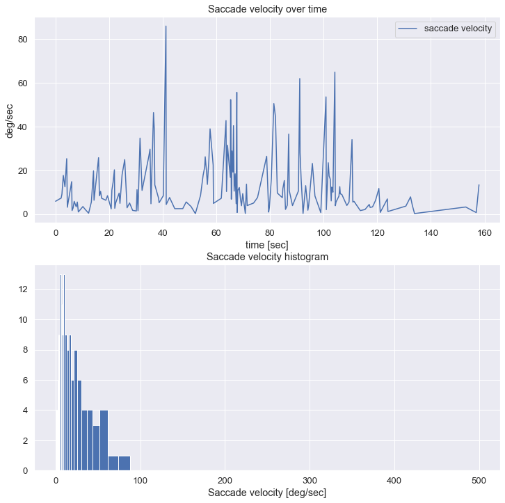#Here we show how to visualize gaze velocity over time as well as the distribution of different velocities.